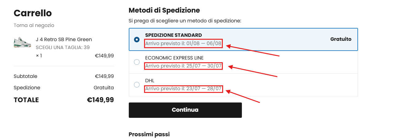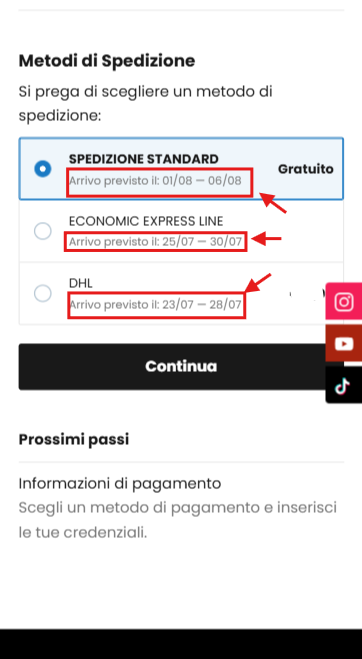 Terzo, seleziona il metodo di spedizione per il tuo ordine.
